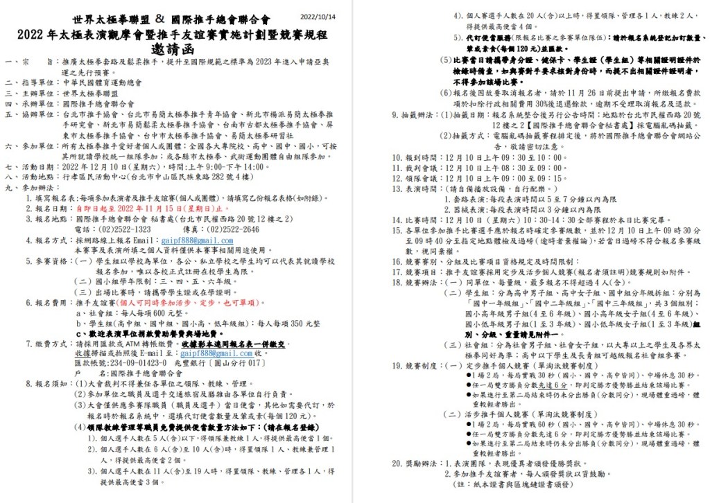 12/10即將舉辦太極表演觀摩會暨推手友誼賽